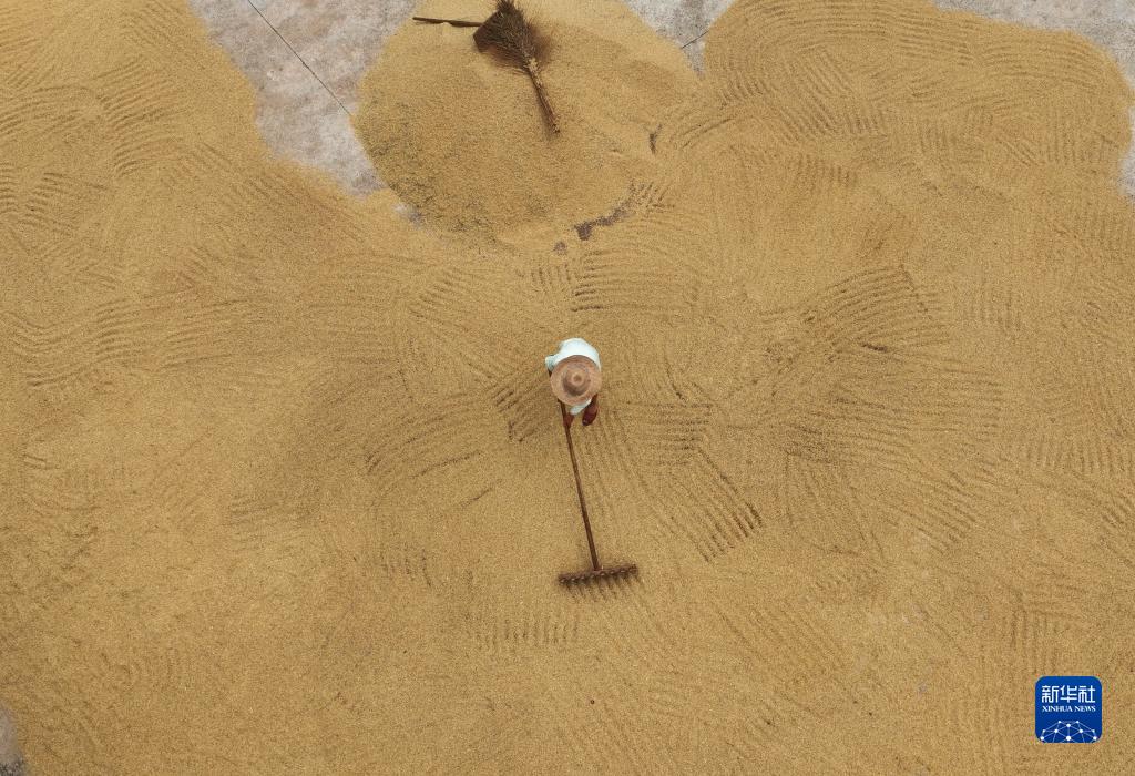8月27日,在湖南省衡陽市石鼓區角山鎮,當地村民在晾曬稻谷(無人機照片)。
