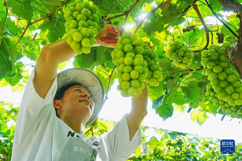 8月27日,浙江省嘉興市海鹽縣沈蕩鎮尤甪村的葡萄種植戶在采摘葡萄。