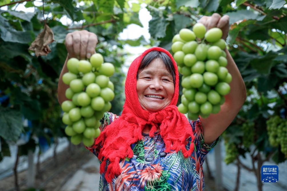 8月27日,農戶在江蘇省興化市林湖鄉鐵陸村生態葡萄園內展示采摘的葡萄。