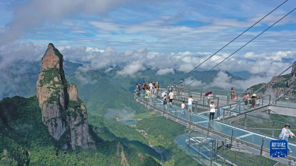 8月27日,學生和家長在浙江省臺州市仙居縣神仙居景區游玩(無人機照片)。