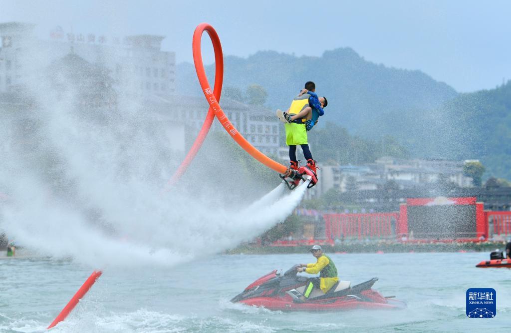 8月25日,一名小游客在湖北省宣恩縣城貢水河上體驗“水上飛人”項目。