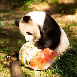 8月27日,大熊貓“添添”在美國首都華盛頓史密森學會國家動物園享用生日蛋糕。