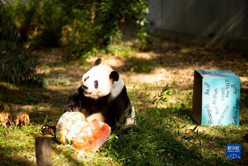 8月27日,大熊貓“添添”在美國首都華盛頓史密森學會國家動物園享用生日蛋糕。