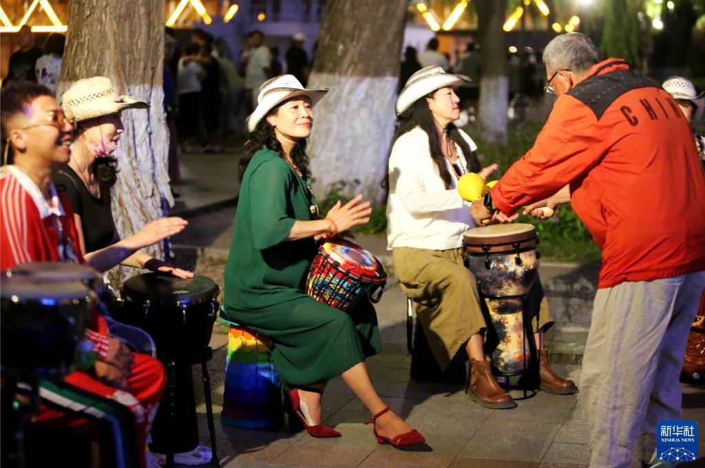 8月27日,民間樂團在哈爾濱松花江畔進行樂器表演。