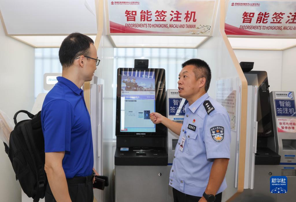8月25日,在北京市公安局西城分局出入境接待大廳,移民管理警察高治國在為一位男士講解如何使用智能簽注機。