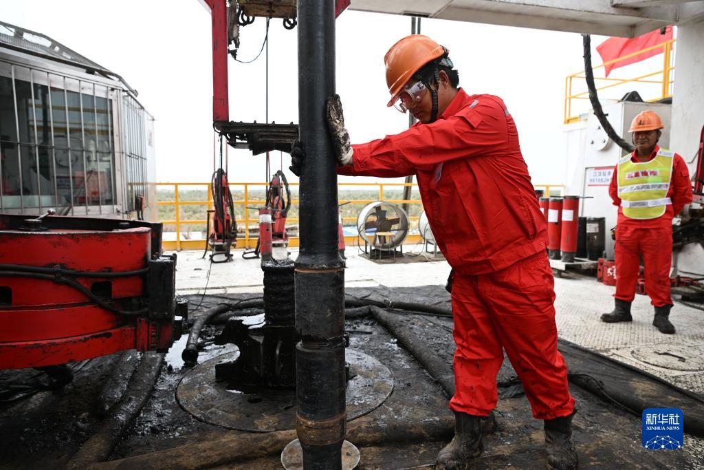 工作人員在中國石化塔里木盆地“深地工程”躍進3-3XC油氣井進行鉆井輔助作業(8月21日攝)。