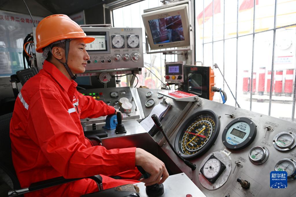 工作人員在中國石化塔里木盆地“深地工程”躍進3-3XC油氣井操作我國自主研發的超深井自動化鉆機進行鉆井作業(8月21日攝)。
