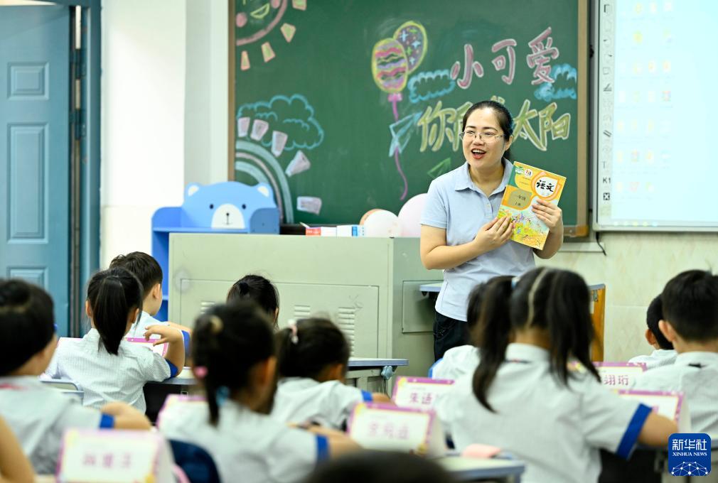 8月28日,廣西柳州市德潤小學一年級教師向新生講解小學課本。
