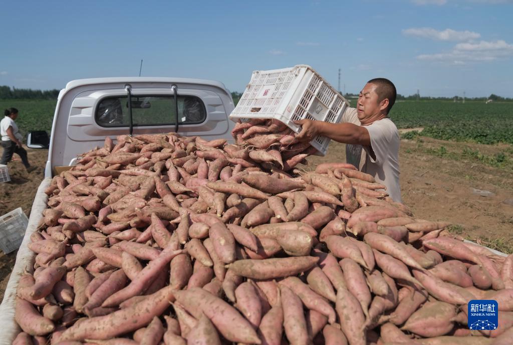 8月28日,灤州市九百戶鎮一家鮮食紅薯種植合作社的社員在將收獲的煙薯裝車。
