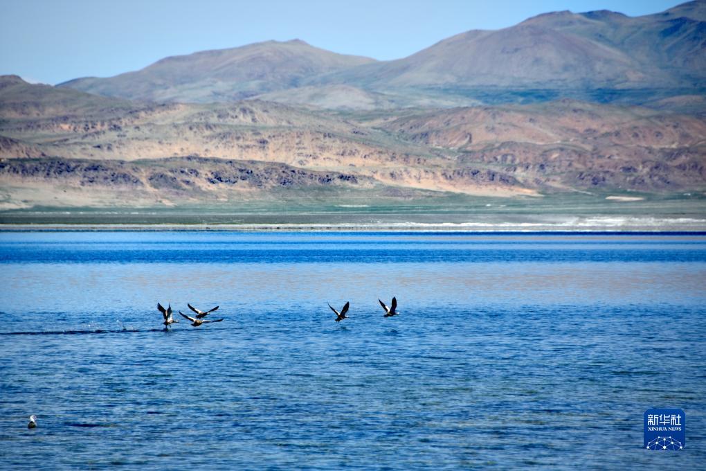 飛鳥從達瓦錯湖面掠過(8月28日攝)。