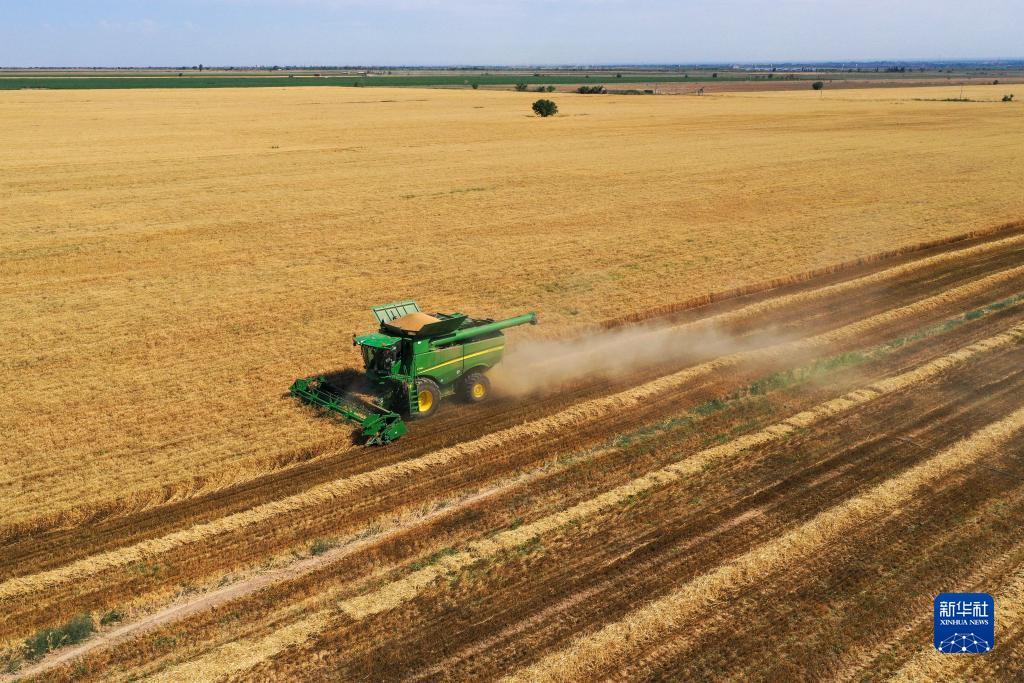 農機手在新疆呼圖壁縣二十里店鎮寧州戶村駕駛聯合收割機收割小麥(7月15日攝,無人機照片)。