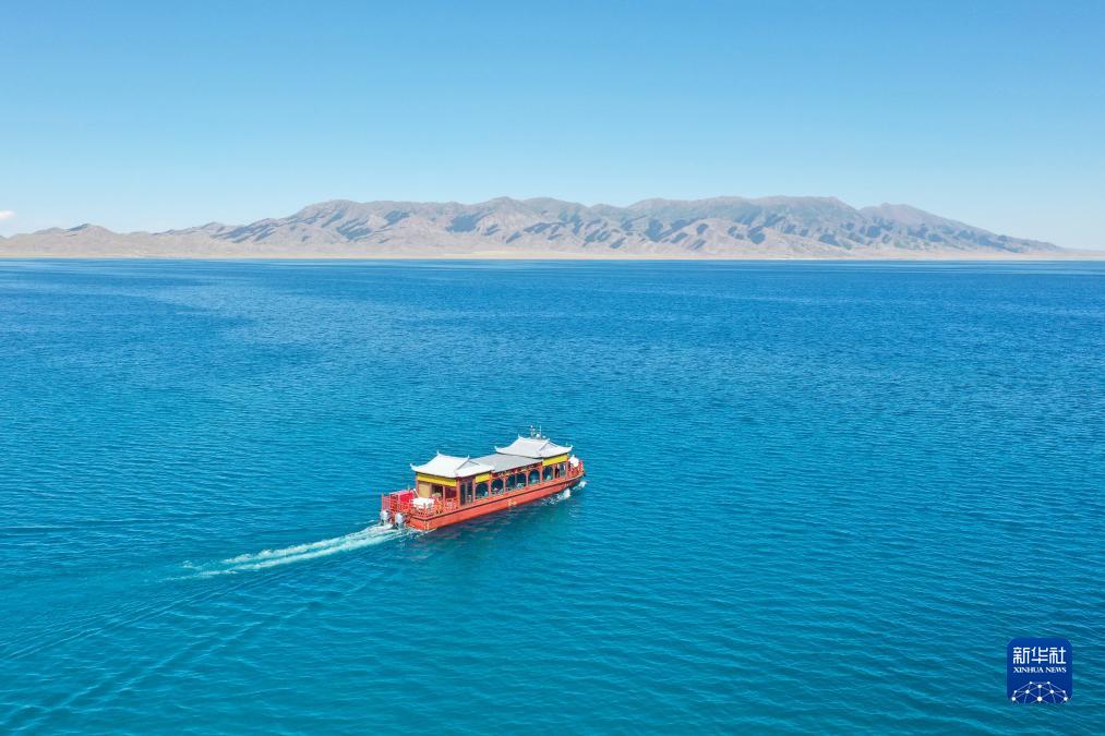 游客乘坐游船在新疆賽里木湖游覽(7月25日攝,無人機照片)。