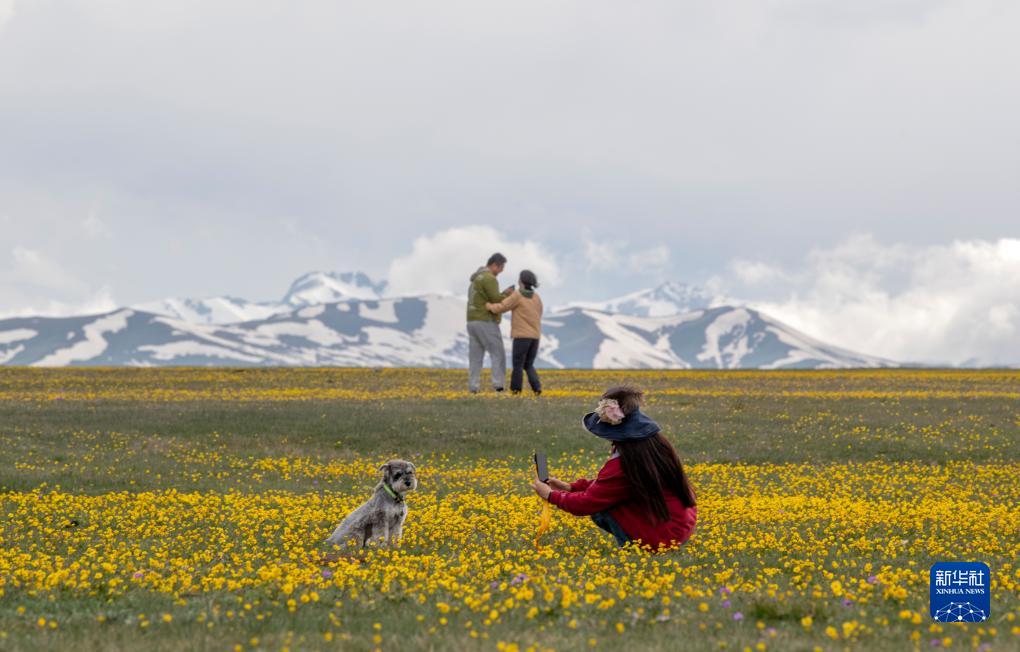 游客在新疆賽里木湖景區拍照(5月21日攝)。