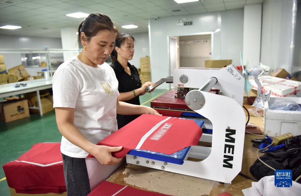 8月29日,工人在河北省威縣姜七里村一家服飾廠對加工服飾進行壓花作業。