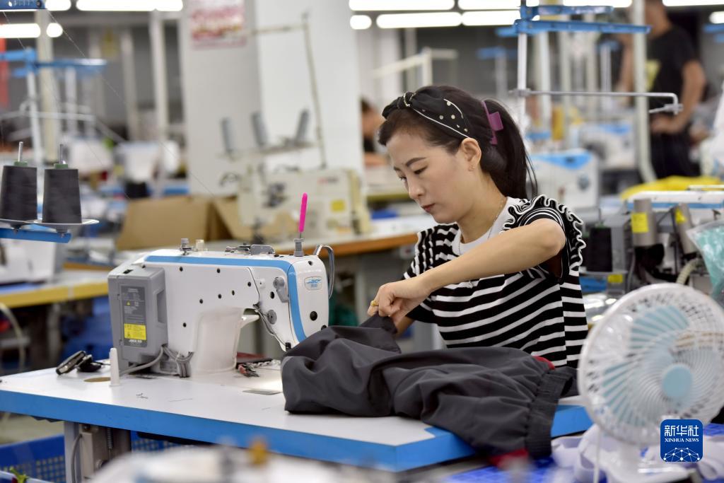 8月29日,工人在河北省威縣姜七里村一家服飾廠加工服裝。