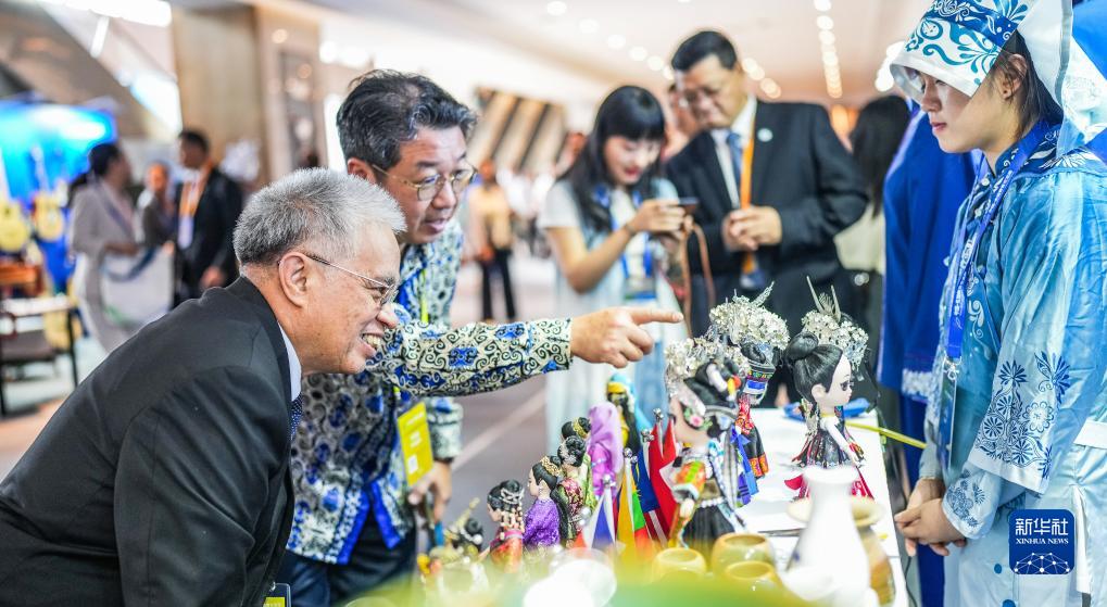 8月29日,參會嘉賓在交流周活動上參觀工藝作品。