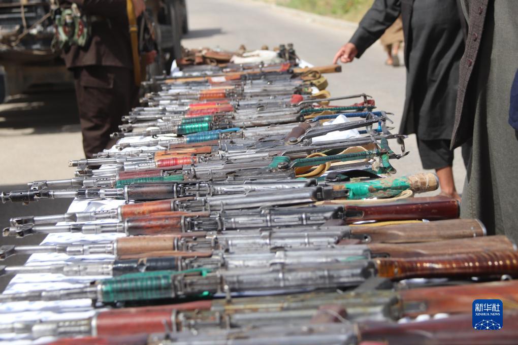 這是8月29日在阿富汗巴爾赫省拍攝的被阿富汗安全部隊收繳的武器。