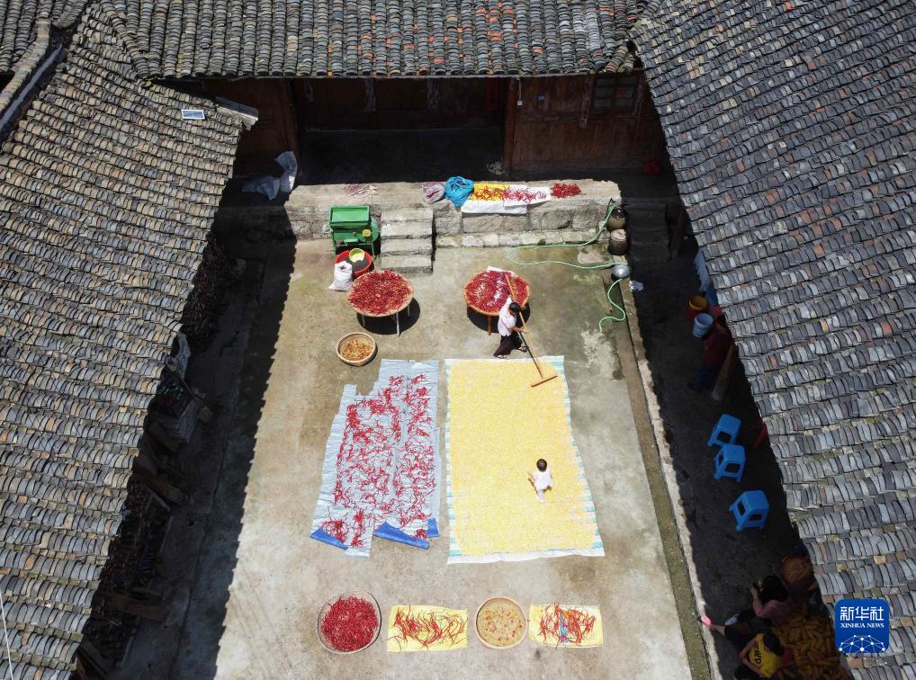 8月29日,貴州省黔東南苗族侗族自治州施秉縣牛大場鎮紫荊村村民在晾曬作物(無人機照片)。