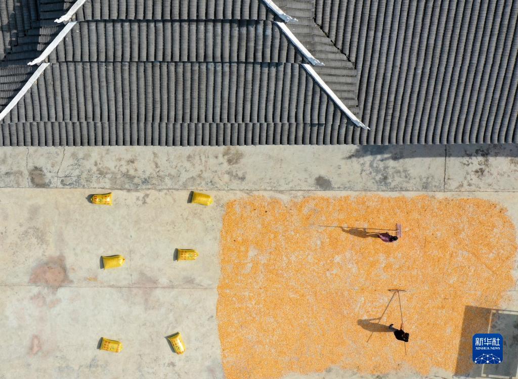 8月29日,貴州省銅仁市玉屏侗族自治縣亞魚鄉郭家灣村農民在翻曬收獲的玉米(無人機照片)。