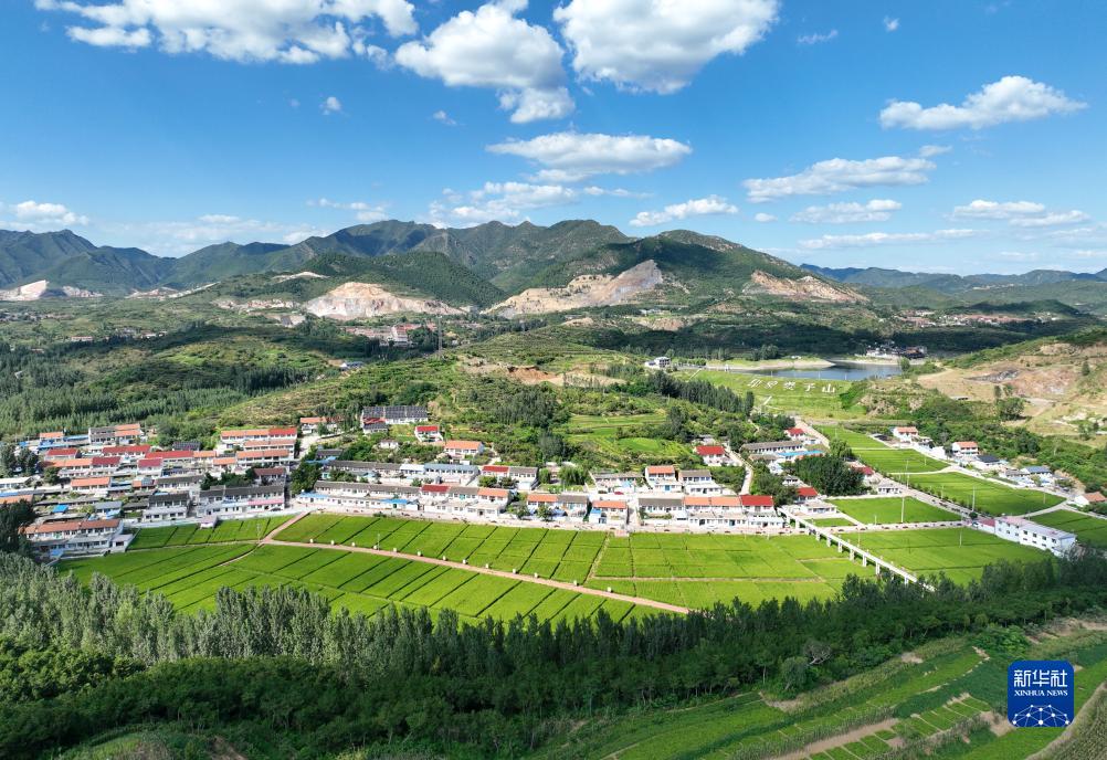 河北省遷安市大崔莊鎮樓子山村的稻田與青山、村莊相映成畫(8月29日攝,無人機照片)。