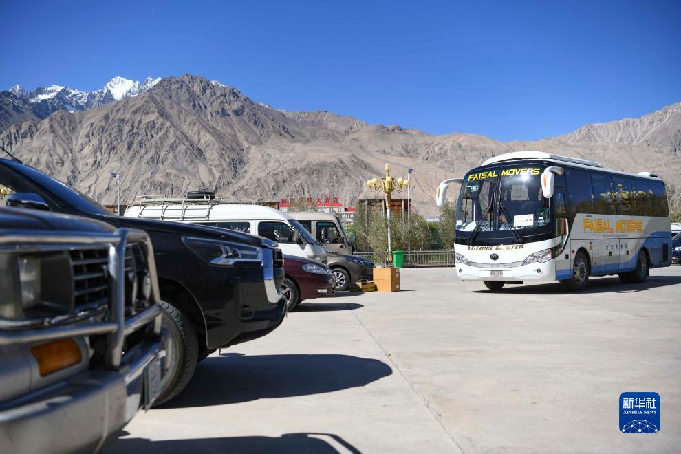 來自巴基斯坦的客車駛入新疆紅其拉甫口岸(8月29日攝)。