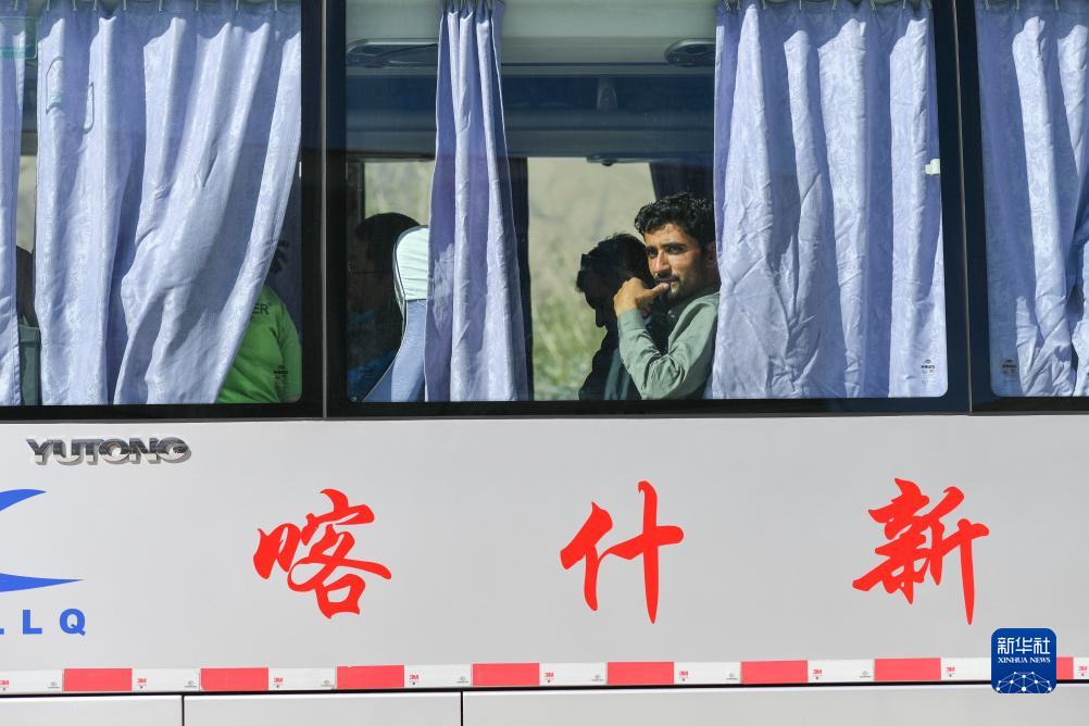 在新疆紅其拉甫口岸,巴基斯坦商人坐在即將出發的國際客運班車上(8月29日攝)。