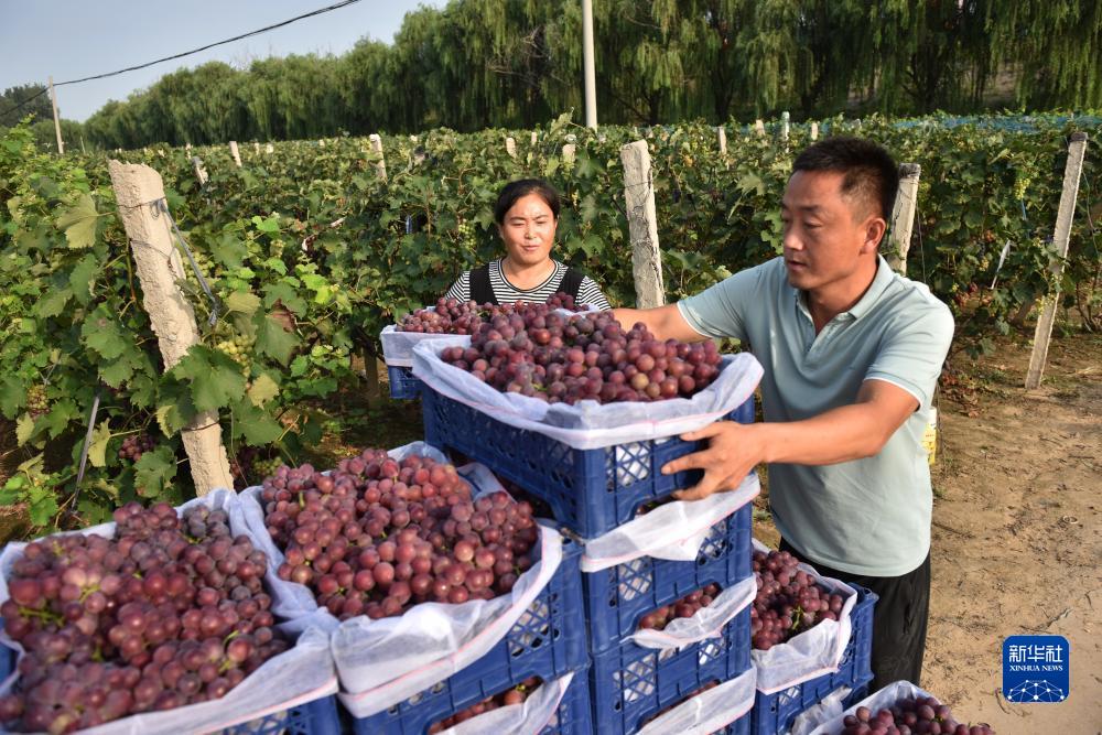 8月30日,邢臺市威縣戚霍寨村一家庭農場果農整理裝筐的葡萄。