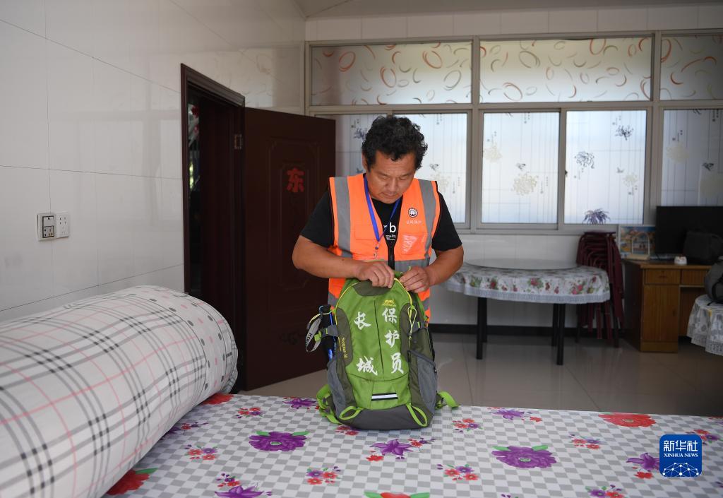 8月29日,俞海文在家中收拾巡查長城所需裝備。