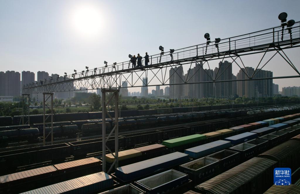8月29日,中國鐵路鄭州局集團有限公司鄭州供電段工作人員在鄭州北站編組場的燈橋上檢修投光燈(無人機照片)。