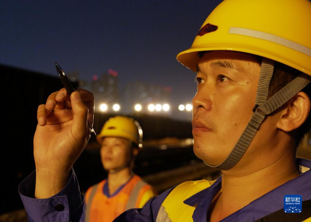 8月29日晚,中國鐵路鄭州局集團有限公司鄭州供電段工作人員在鄭州北站編組場通過夜間巡視對白天檢修過的燈橋亮燈情況進行統計。