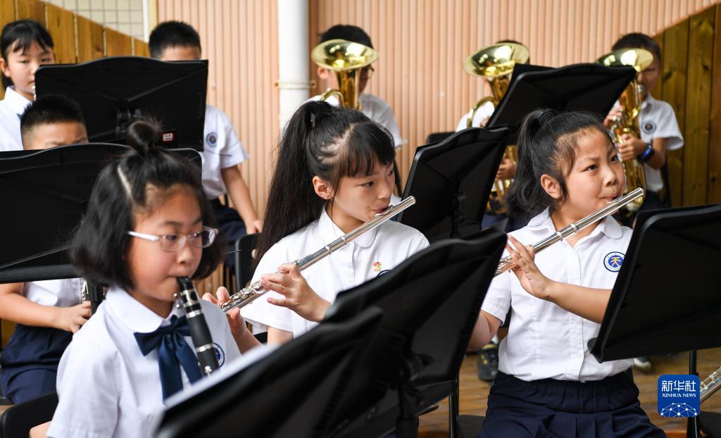 8月30日,重慶市南岸區天臺崗雅居樂小學管樂團成員為前來報到的學生和家長演奏樂曲。