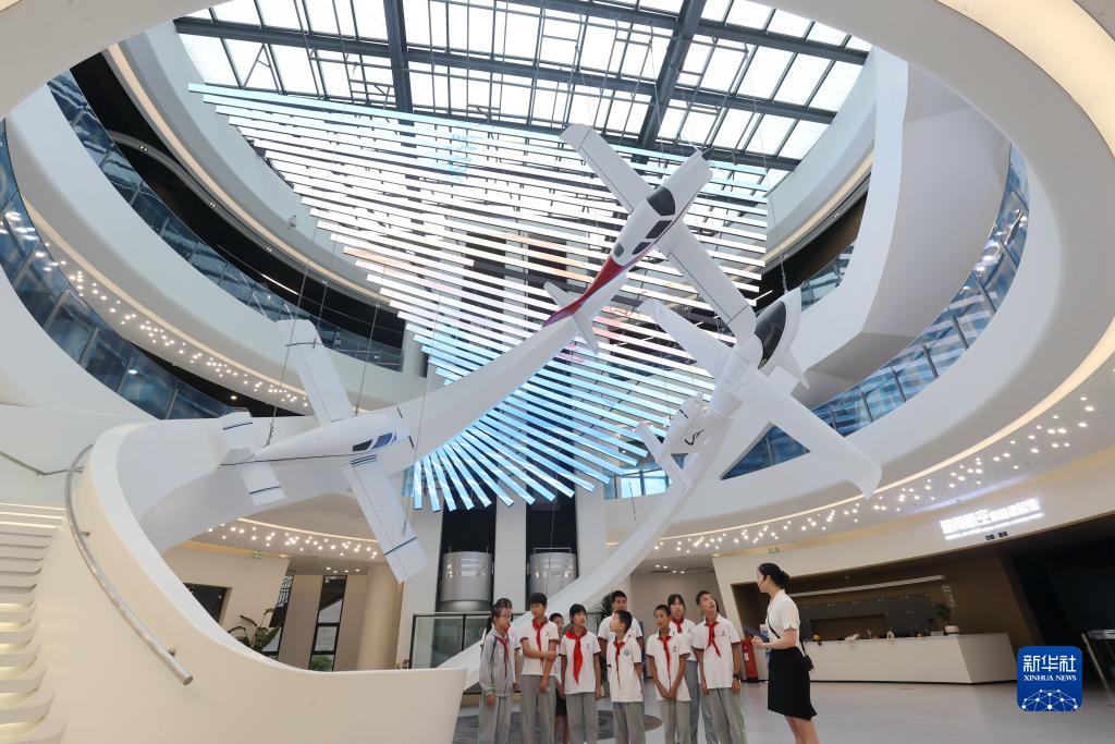 8月30日,在德清縣通航智造小鎮通用航空科普體驗館,雷甸鎮中心小學學生在參觀航空科普展品。