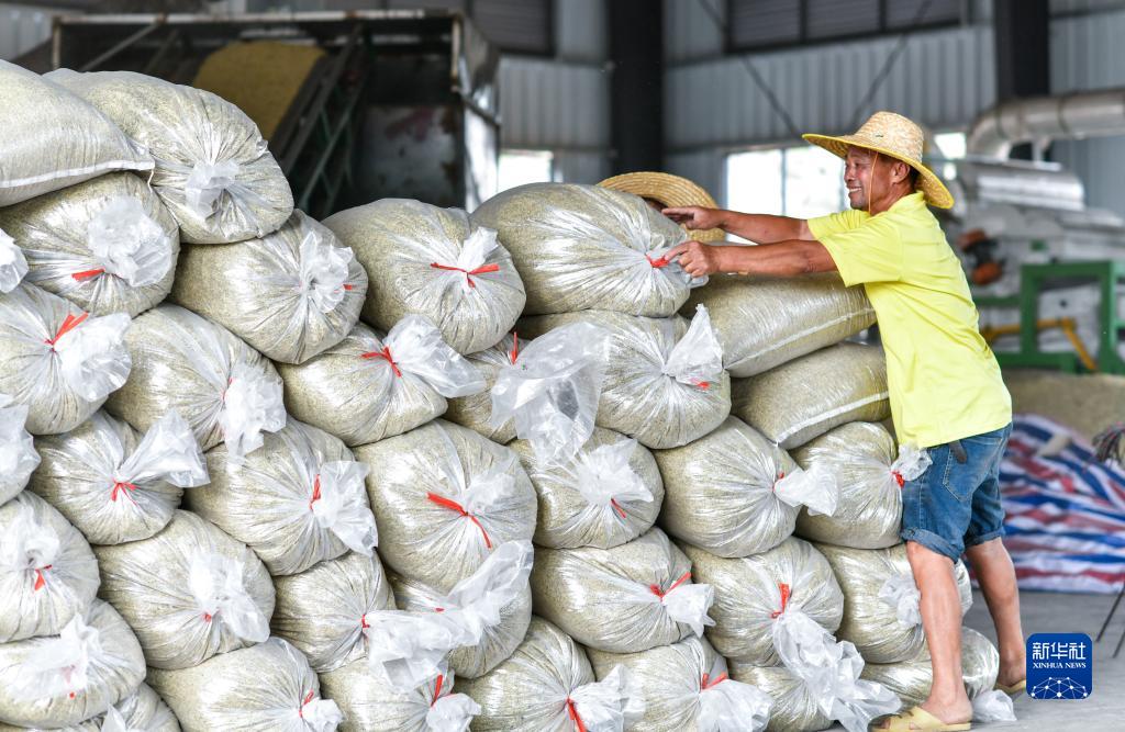陳良東在種子加工車間搬運今年收獲的稻種(8月26日攝)。