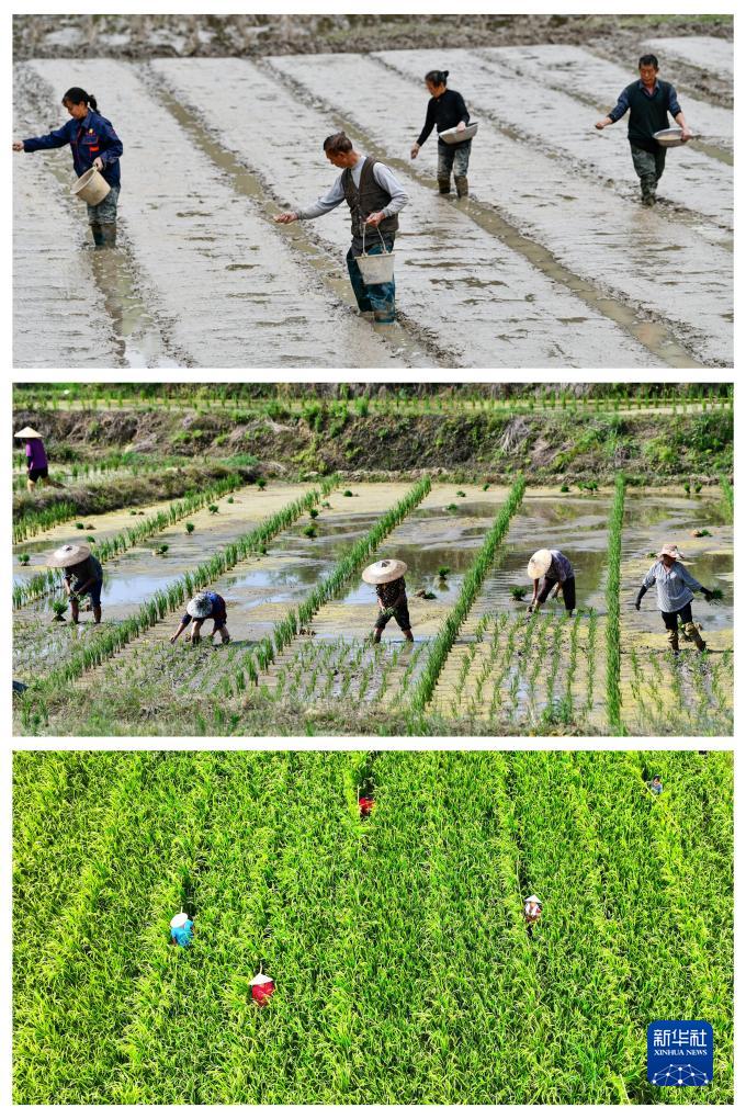 拼版照片:上圖為村民在陳良東的水稻制種基地里播種(4月7日攝);中圖為村民在陳良東的水稻制種基地里插秧(5月29日攝);下圖為村民在陳良東的水稻制種基地里“趕花”授粉(8月1日攝,無人機照片)。