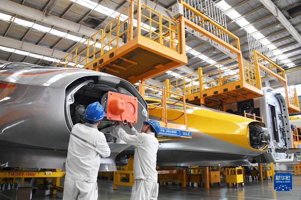 8月29日,中車青島四方總裝車間工作人員在復興號智能動車組生產線上進行裝配作業。