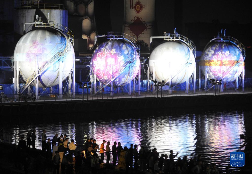 2012年9月17日,游客在位于北京市石景山區的首鋼園欣賞“閃耀北京”光影文化季暨首鋼燈光節上的燈光夜景。