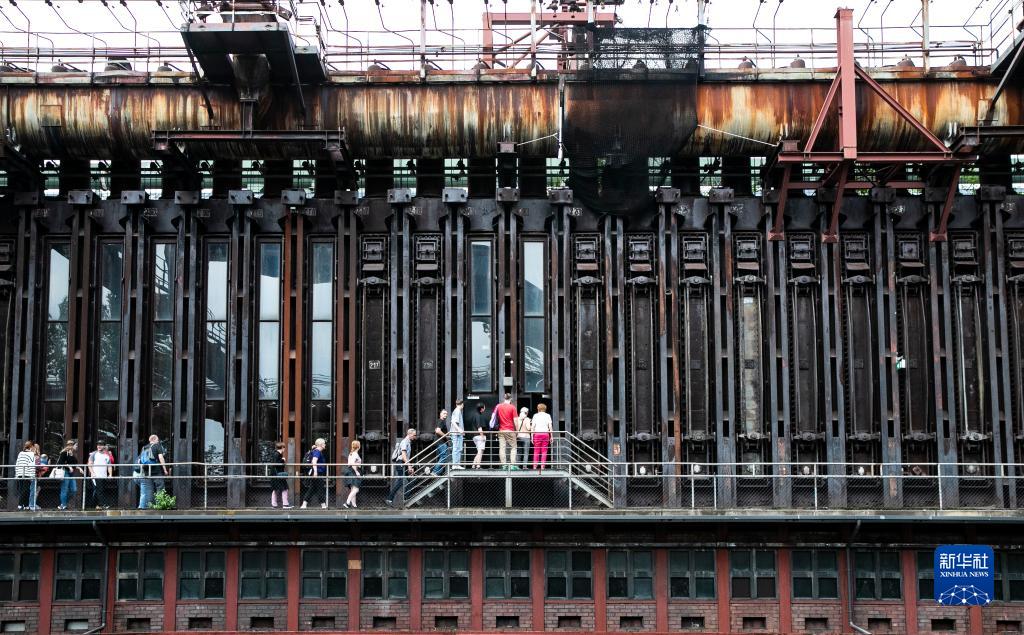 8月16日,在德國埃森的關稅同盟煤礦工業區,人們在導游帶領下參觀焦化廠內部。
