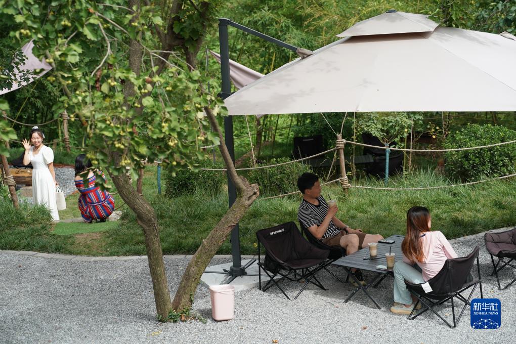 游客在秦嶺北麓的西安市周至縣馬召鎮辛口村一家咖啡館的營地內休閑(7月14日攝)。