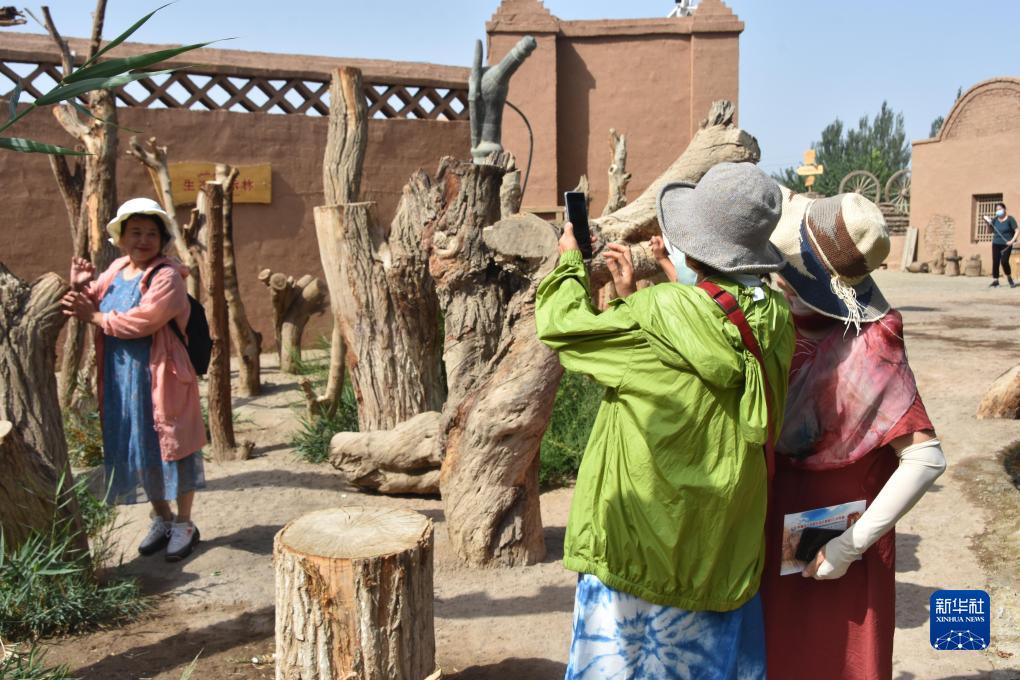 8月30日,游客在位于新疆吐魯番市的坎兒井樂園景區拍照留念。