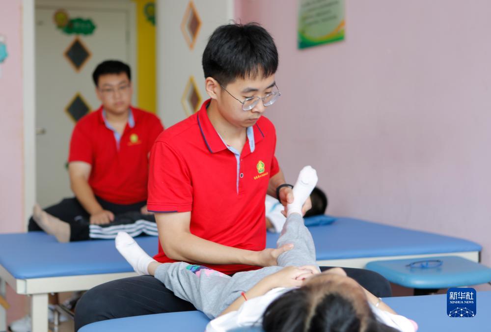 8月30日,在江蘇揚州寶應縣小天使幼兒園,理療師幫助小朋友做康復治療。