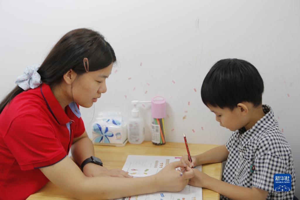 8月30日,在江蘇揚州寶應縣小天使幼兒園,小朋友在老師指導下學習。