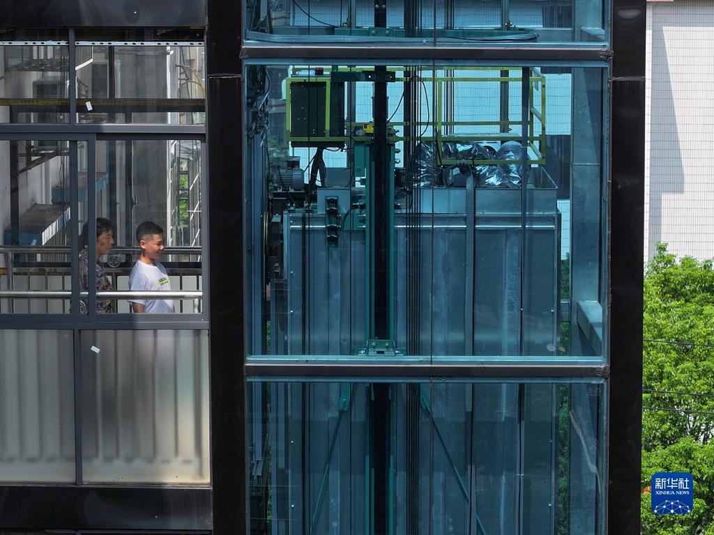 8月30日,在湖南省岳陽市平江新城學校教職工宿舍,居民準備乘坐加裝的電梯出門(無人機照片)。