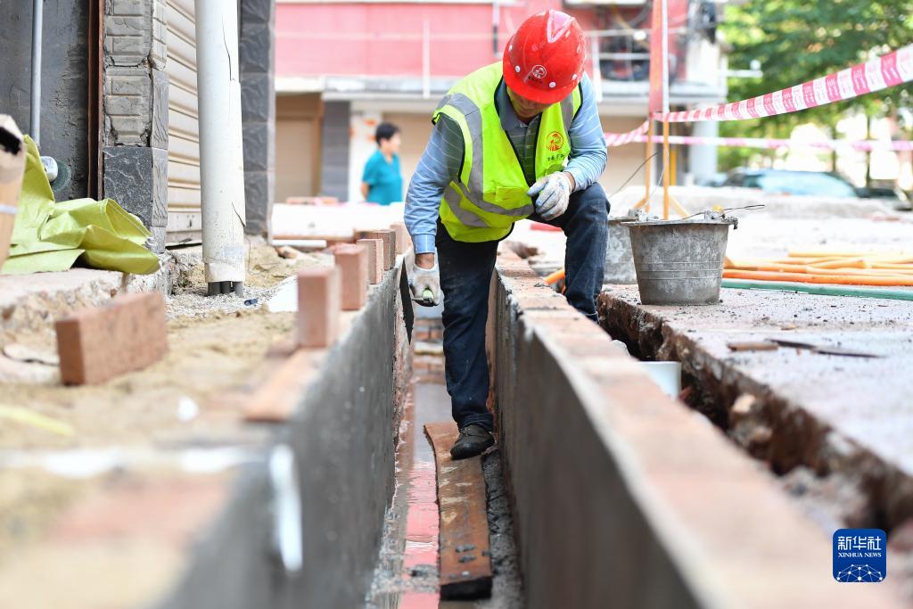 8月30日,在湖南省岳陽市平江縣金盾小區,工人在砌筑排水渠。