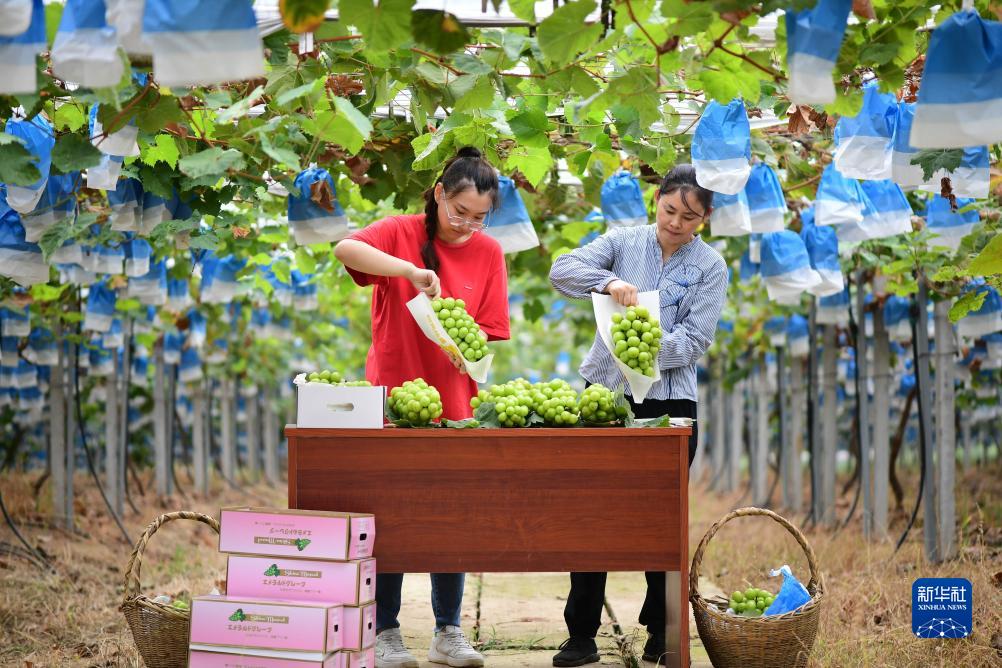 8月30日,潘雅潔(左)在肥西縣紫蓬鎮的葡萄園里包裝剛采摘的葡萄。