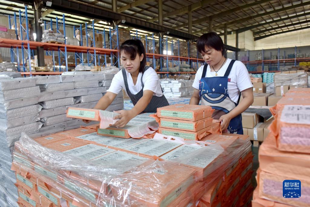 8月30日,河北省邢臺市南和區和陽鎮一家寵物用品電商企業工人在倉庫打包產品,準備發貨。