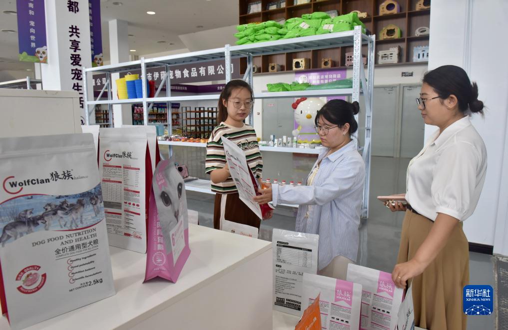8月30日,顧客在河北省邢臺市南和區賈宋鎮一家寵物用品生產企業電商展廳了解產品信息。