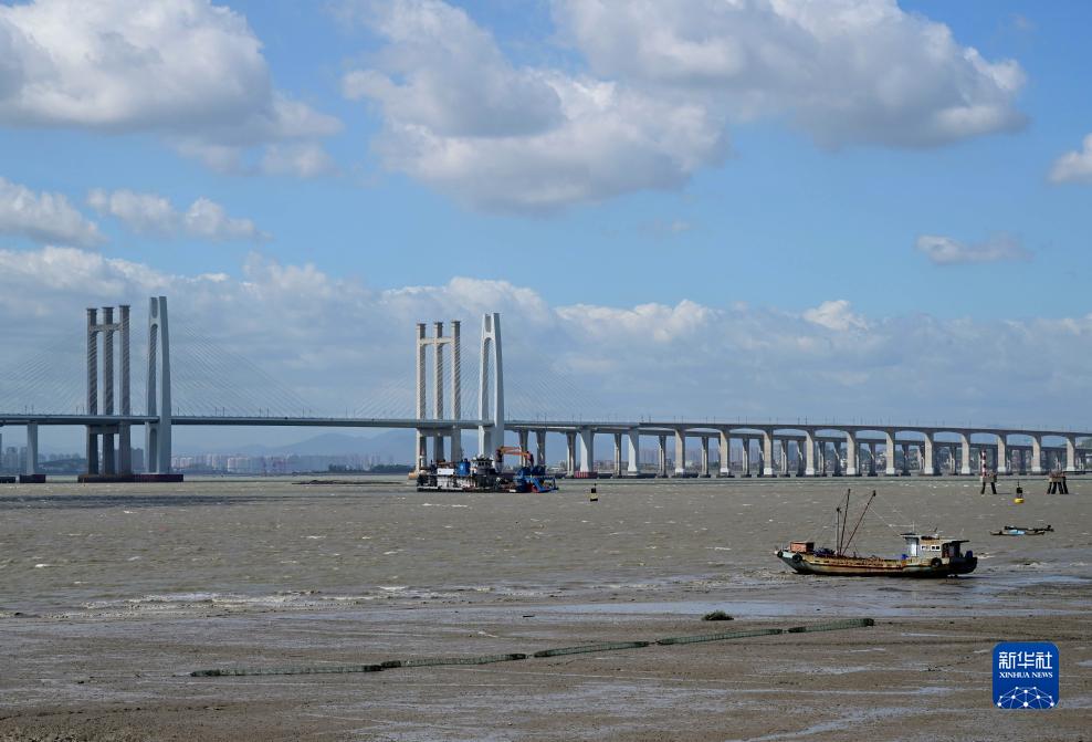 8月30日,在福建泉州灣跨海大橋附近海域,海上作業施工船停工,漁船靠岸停泊。