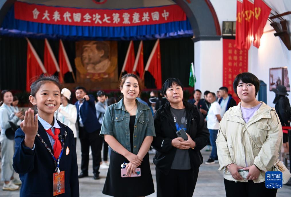 8月29日,延安楊家嶺革命舊址的“小小講解員”賀偲彤(左一)為游客講解。賀偲彤是延安市寶塔區新新小學的學生,常利用寒暑假時間在楊家嶺革命舊址做義務講解。