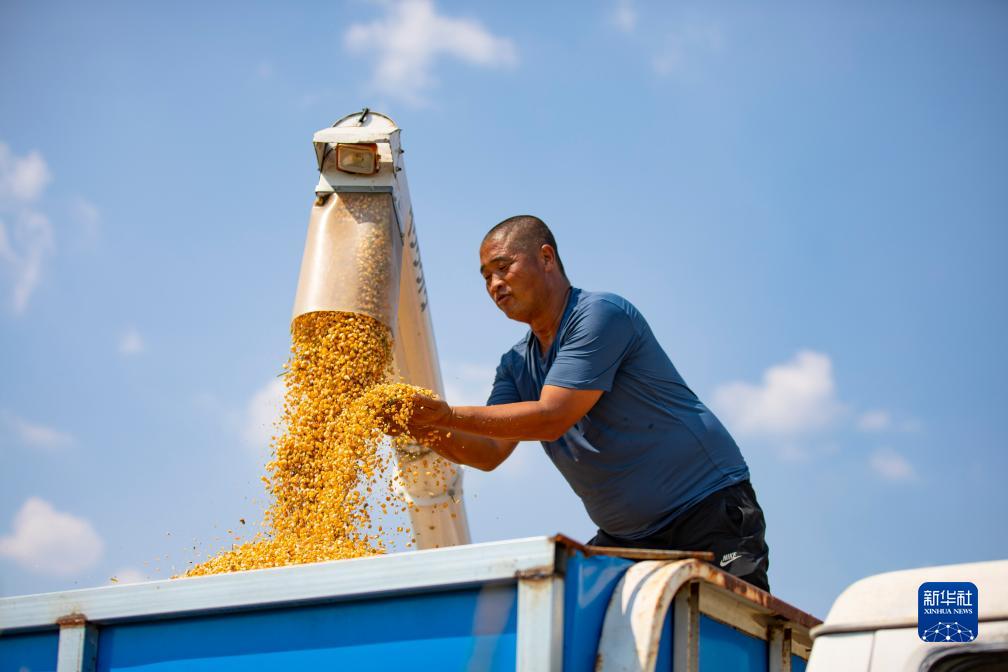 8月30日,在山東省東營市廣饒縣李鵲鎮的萬畝優質糧食智能示范區,農民把收獲的玉米裝車。