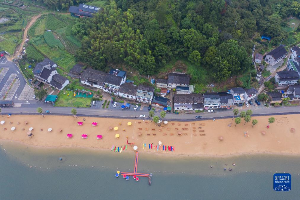 8月30日拍攝的長汀村的長汀沙灘景區(無人機照片)。云和縣石塘鎮長汀村位于浙江省第三大人工湖——云和湖畔、“十里云河”美麗鄉村風景線的中心路段。